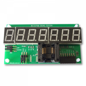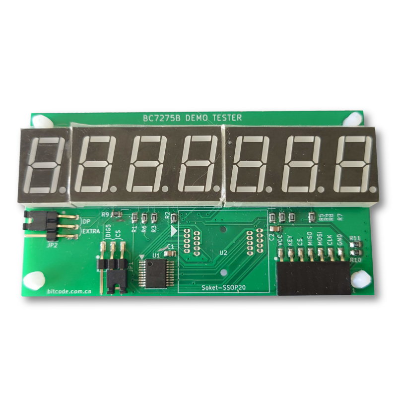 板上包含完整的BC7275应用电路,使用7只0.56吋数码管,通过跳线可配置为5位(使用片选)和6位(不使用片选)模式,以及选择各位小数点作为小数点还是扩展的数码管位。
