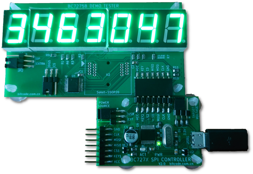 电路板上焊接7线插座,引出SPI接口和电源,可以直接插入BC727x控制板(USB转SPI) ,配合软件利用电脑演示调试BC7275的各项指令和功能,也可连接用户电路板,调试用户软件。