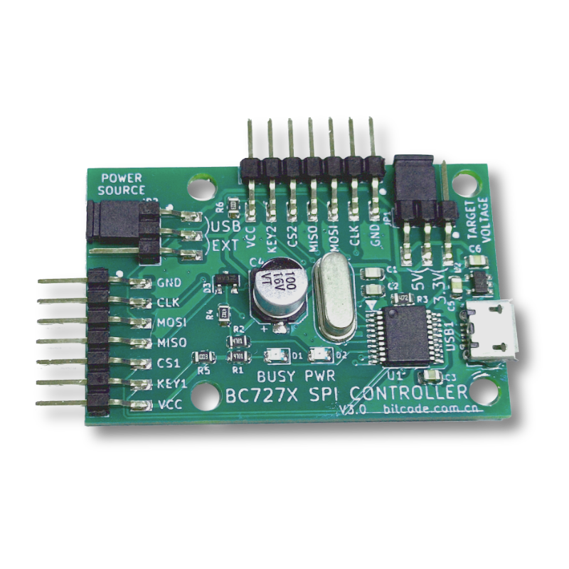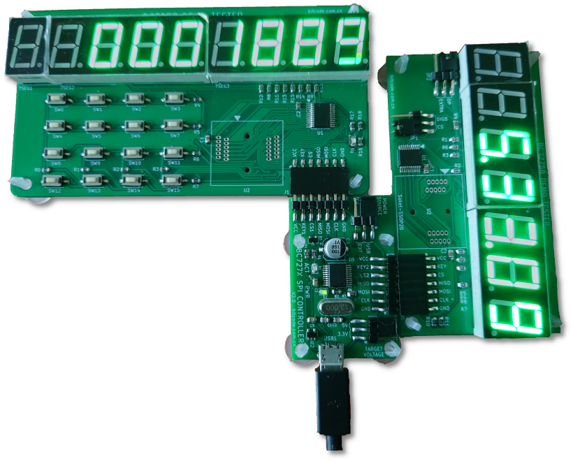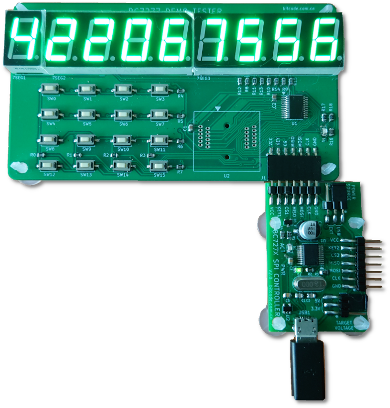 此控制板上有2个SPI接口,每个接口都具有BC727x所需的所有信号:CLK,MOSI,MISO,CS,和KEY。两个SPI口时钟和数据线共用,以CS信号选择。因此控制板可以同时驱动两个相同和不同型号的BC727x电路,两边可以同时运行不同的演示程序而不互相影响,两边的键盘显示亦各自独立。